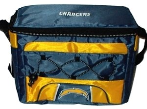 San Diego Chargers NFL Insulated Cooler Lunch Bag Tote. Carry your drinks and snacks in this insulated soft-sided lunch bag tote. Made for easy carrying of up to six of your favorite beverage. Expandable cord on front of bag for water bottle. Adjustable handle strap. The San Diego Chargers logo is displayed prominently on the top and front of this durable cooler bag. Use this San Diego Chargers Kooler Bag for easy transport to the next game or to your workplace. Measures 8" High" x 10 1/2" Wide x 5 Deep".Great gift for the baseball fan or for tailgating!